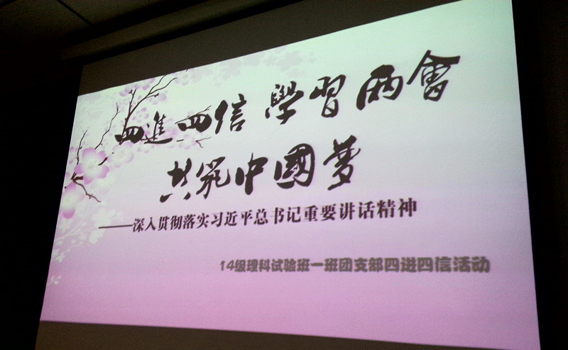 为深入贯彻习近平总书记系列重要讲话精神,响应“四进四信”的号召,3月28日晚,bet38365-3652014级理科试验一班在五教5306教室举办了“四进四信,学习两会,共筑中国梦”的主题班会。